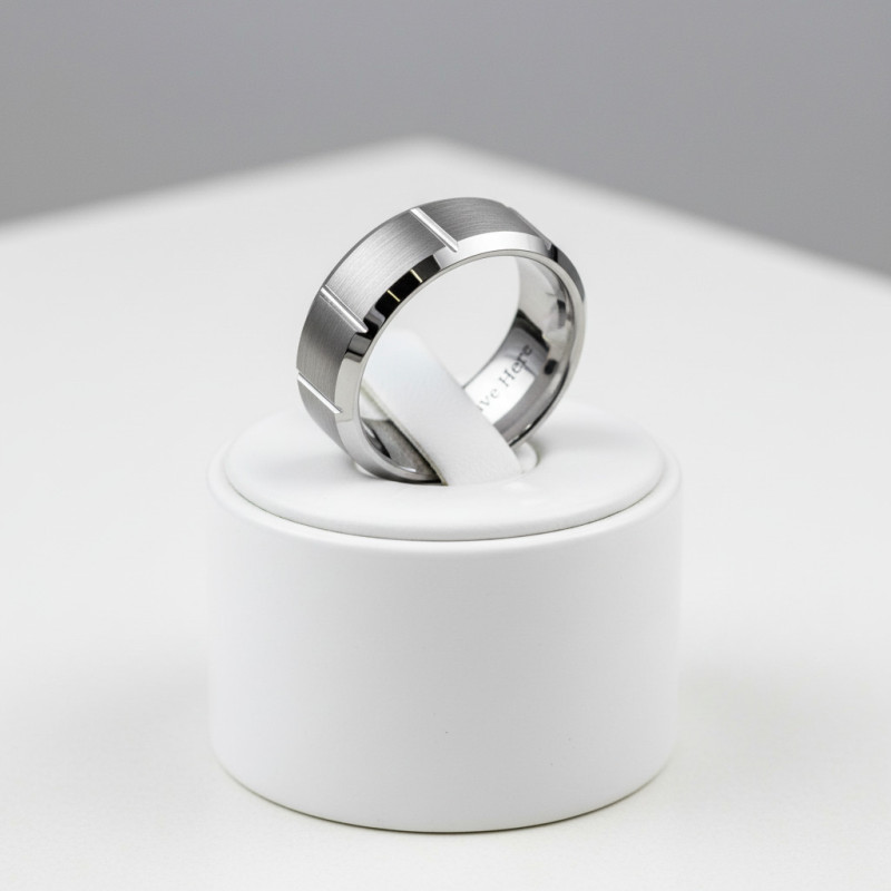 Width: 8mm.This 8mm Men’s Tungsten Ring with Vertical Groove Detailing and Satin Finish is an exquisite piece of jewellery for the discerning gent. Beautifully made in polished tungsten, it features a contrasting centrepiece with vertical groove detailing evenly spaced across the surface of the band. A modern tungsten ring for men with classic styling, it would make a stunning engagement or eternity ring. Engrave the inside with your initials to create something truly unique. Due to the nature of tungsten, we cannot offer any resizing on this ring.
